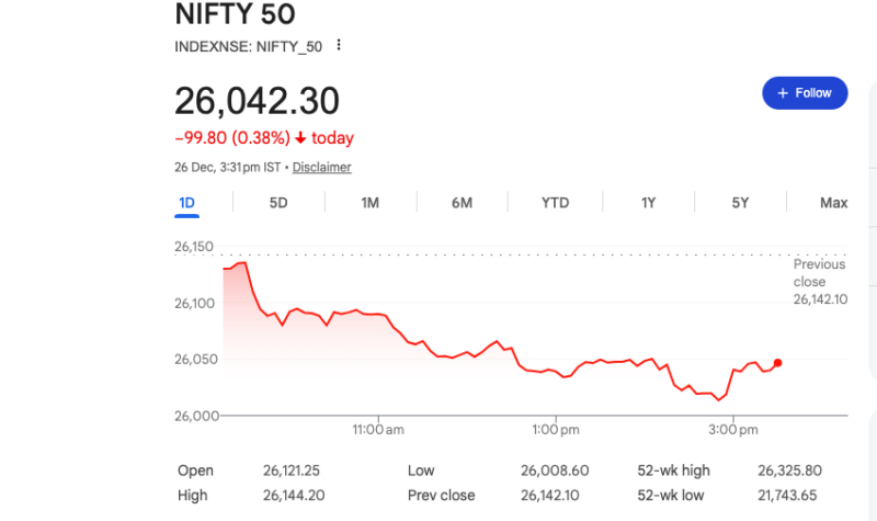 డిసెంబర్ 26, శుక్రవారం రోజున భారత స్టాక్ మార్కెట్లు వరుసగా మూడో రోజు నష్టాలతో ముగిశాయి. సెన్సెక్స్ 367.25 పాయింట్లు క్షీణించి 85,041.45 వద్ద, నిఫ్టీ 99.80 పాయింట్లు పడిపోయి 26,042.30 వద్ద స్థిరపడింది.